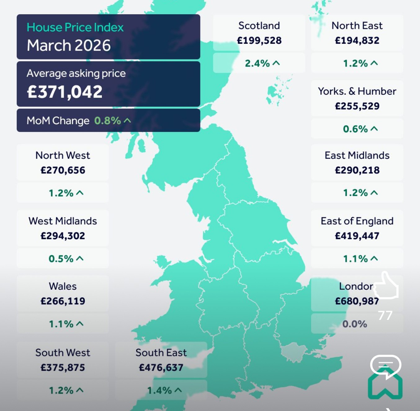 Scotland, led by Glasgow property market has the highest growth in the UK for March 2026 of 2.4%.